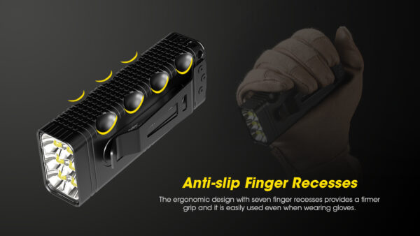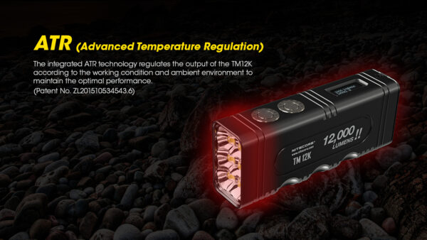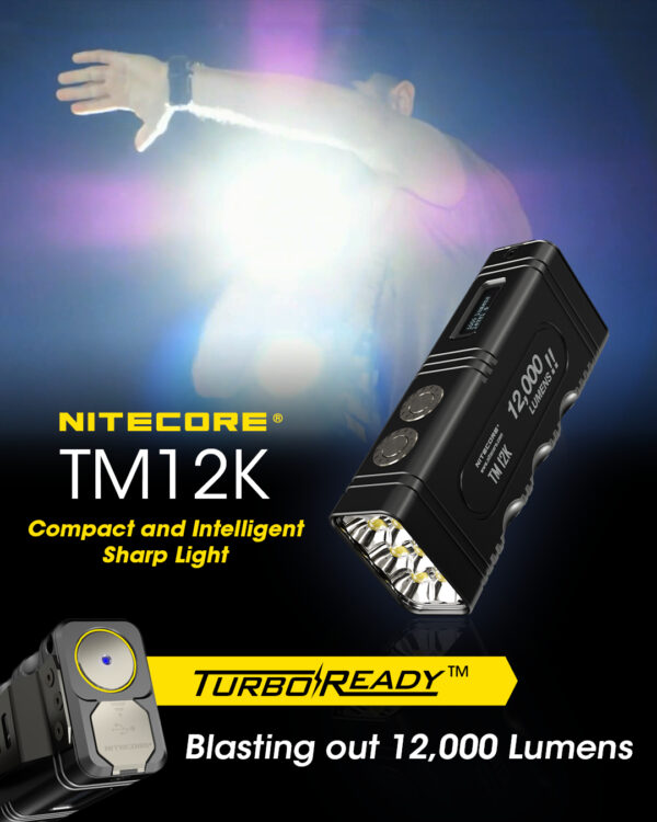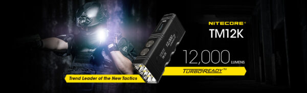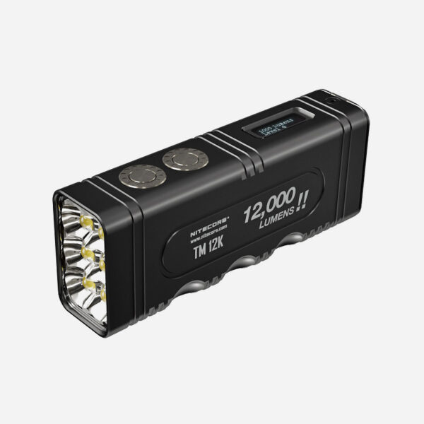 Зарядният фенер Nitecore TM12K е с 6 x CREE XHP50 светодиода, мощността на TM12K е увеличена до 12 000 лумена, а интензитетът на лъча достига 15 600 cd. Освен това, TM12K има CNC машинно обработен unibody дизайн, отличаващ се с лекота, здравина и отлично разсейване на топлината. Ергономичният дизайн със 7 вдлъбнатини за пръсти с противоплъзгащо покритие осигурява по-здрав захват и заедно с двойните странични бутони и задния превключвател, позволява различни операции с една ръка. Захранван от вградената литиево-йонна батерия 21700 с висок ток на разреждане 4800 mAh, TM12K осигурява постоянна употреба от 200 часа при ULTRALOW режим. Освен това, може да се зареди напълно за 1,5 часа с мощност на зареждане от 18 W, тъй като е наличен с QC 2.0, а USB-C портът е оборудван с висококачествена метална магнитна защитна капачка. Подобно на предишното поколение, TM12K е оборудван с OLED дисплей с ниска консумация на енергия, който е винаги готов да покаже текущото състояние на фенерчето, а също така предлага регулируема ВИСОКО ниво на яркост. TM12K е идеален за справяне с всякакви инциденти, тъй като е със степен на защита IP68 и е устойчив на падане от 1 м с режим на полу-заключване и режим на пълно заключване.