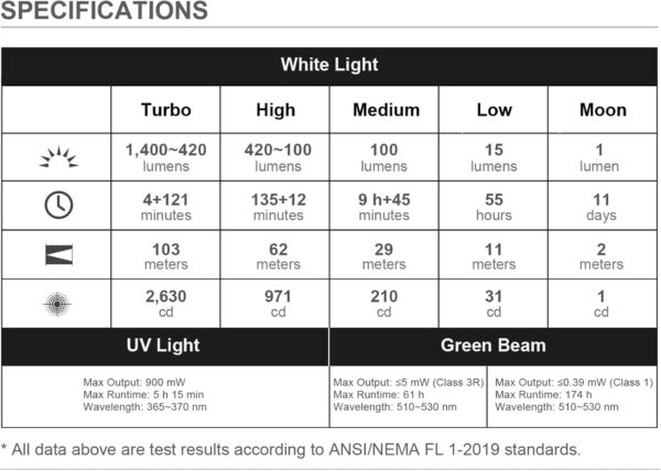Характеристики на Заряден Фенер Olight Arkfeld Ultra 1400 Лумена бяла, UV светлина и Зелен Лазер Olive Green