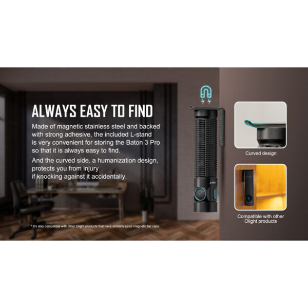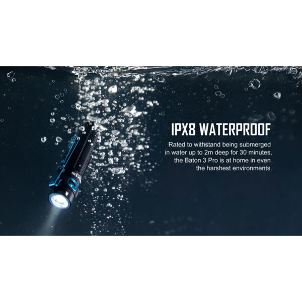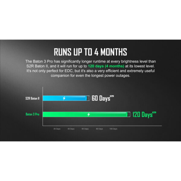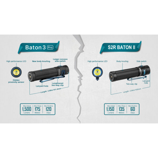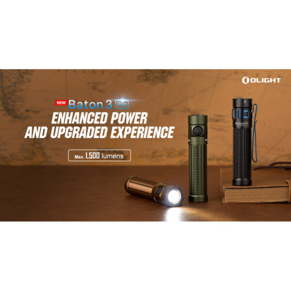 Зарядният Фенер Olight Baton 3 Pro е подобрената версия на S2R Baton II. Той е по-мощен с до 1500 лумена, увеличение от 30% спрямо S2R Baton II. Нова технология сензор за автоматично намаляване яркостта, когато има препятствие близо пред рефлектора. С цветова температура, студено бяло, той отговаря на различни нужди и може да се справи при всякакви сценарии. Захранва се с акумулаторна литиево-йонна батерия 18650 3200mAh която се зарежда напълно за 3,5 часа с помощта на USB магнитно зарядно. Можете да работите с Baton 3 Pro до невероятните 120 дни. В комплекта е добавена L-образна стойка ,също така разширен и удължена двупосочен клипс, с който по-сигурно може да закачите фенера на раница или джоб.