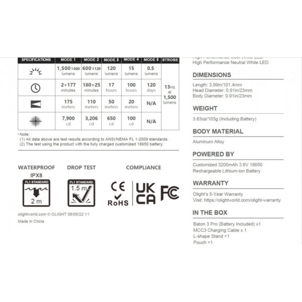 Характеристики на Заряден Фенер Olight Baton 3 Pro 1500 Лумена CW