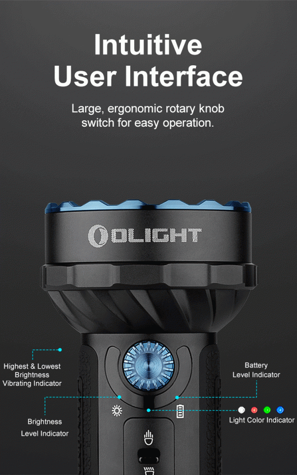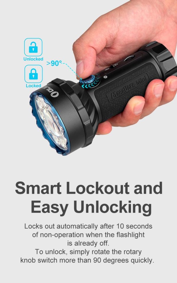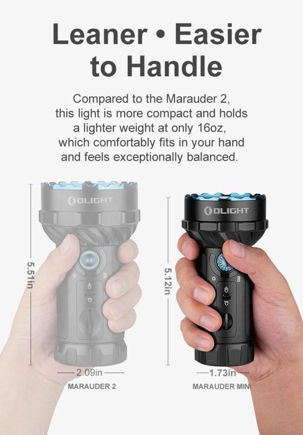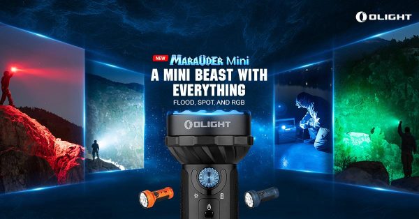Фенерът Olight Marauder Mini е миниатюрна версия на серията фенерчета Marauder. Мощен акумулаторен двулъчев LED фенер в комбинация с „къси“ светлини с широко осветяване, така и с концентриран, далекобоен лъч. Следвайки дизайна на лещите на Marauder mini е съставен от 9 светодиода около центъра, със седем нива на яркост, които осигуряват 200-7000 лумена. В центъра има голям кръгъл светодиод, осигуряващ 600-метра далекобоен лъч на прожектора. Три RGB (червен, зелен и син) цветни светодиода са равномерно разпределени около събирателната леща, което прави фенерът подходящ за използване във всяка ситуация. Превключвателят  позволява бърз достъп за избор на прожектор, горният въртящ се интуитивен  бутон е за регулиране на нивата на яркост. Фенерът разполага с индикатори, които показват нивото на яркост, нивото на батерията и трите цветни режима с RGB светлини. Също така е добавен термаленсензор, който автоматично намалява светлината, за да осигури температура на корпуса под 50 градуса при продължителна употреба с висока мощност. Захранва се от акумулаторна литиева батерия 24Wh 32650, дава продължително време на работа и е съвместим с магнитния кабел за зареждане MCC3 на Olight. Обвито с 270-градусов силикон, повърхността на тялото на фенерчето осигурява по-удобен и стабилен захват. Скритият дизайн на отвора за връзка спомага лесното съхранение, носене и ежедневно използване. В комплект с кобур за носене на колана.