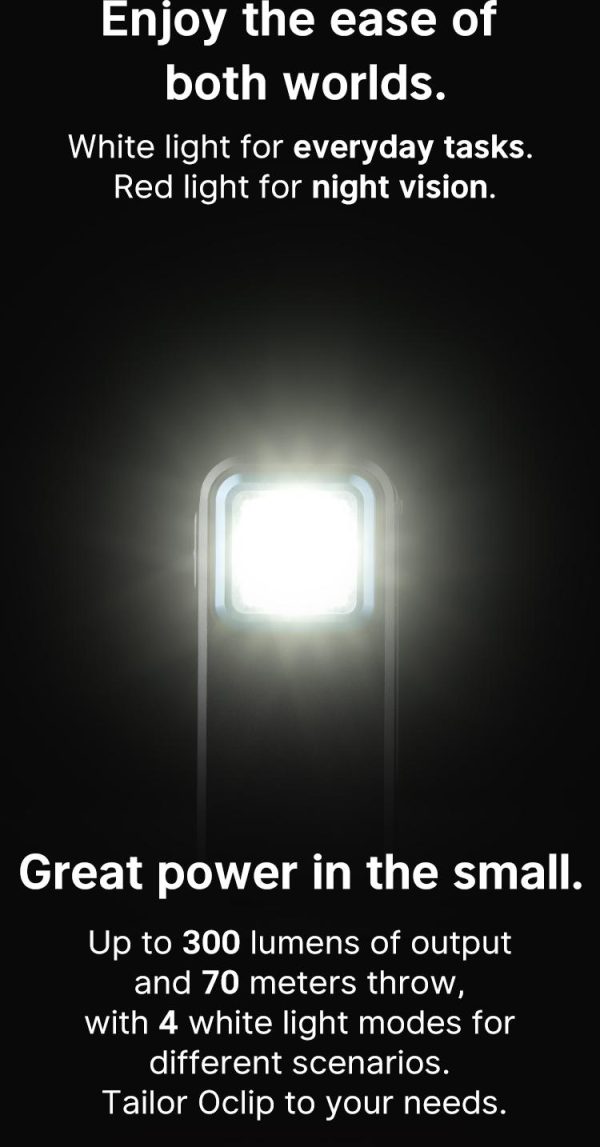 Фенерът Olight Oclip 300 Лумена е малък и практичен, който лесно може да бъде носен навсякъде. Тази компактна мощност тежи само 30 грама и осигурява максимална светлинна мощност до 300 лумена. Освен това има функция за червена светлина, която запазва нощното виждане и може да се използва например при туризъм. Mоже да бъде закрепен с удобна щипка към джоб на гърдите, колан, раница, чанта или дори подгъва на риза, така че да е винаги на разположение. На гърба си Oclip has силен магнит, който може да се използва за закрепване например към отворен капак на кола или може да се постави отстрани на автомобила при смяна на гума на тъмно път. Oclip работи с вградена 280 mAh батерия, която осигурява непрекъсната работа на максимална мощност за един час, а в режим на най-ниска мощност Moonlight свети до 30 часа. Батерията може да се зарежда по модерен начин през USB-C порта с включения кабел за зареждане. Светлинният индикатор в центъра на превключвателя за захранване показва състоянието на зареждане на батерията в три различни цвята, което улеснява проверката на състоянието на батерията по време на зареждане. Удароустойчивият Oclip е защитен от пръски вода съгласно клас на защита IPX5, така че може безопасно да остане на раницата дори по време на дъждовна разходка.