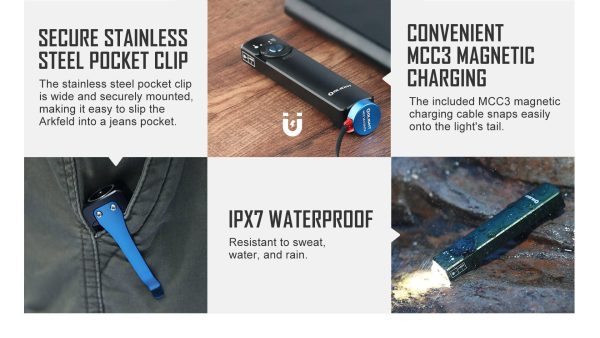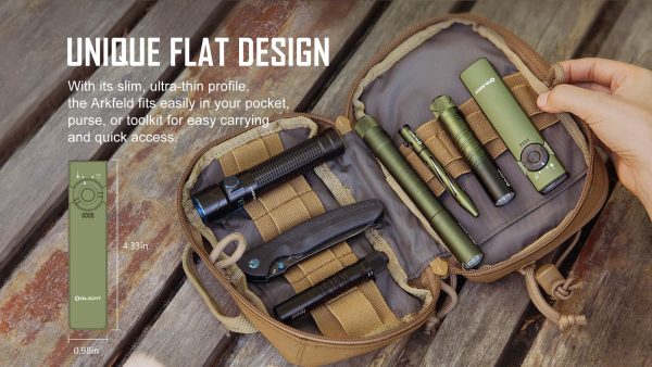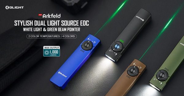 The Olight Olight Arkfeld 1000 Lumens NW Flashlight is a flat EDC flashlight with a laser pointer. Equipped with 5 brightness levels, as well as a memory function that allows you to select what you like with one click. Maximum output of 1000 lumens with neutral diode (4000-5000K). The green laser is handy and practical when you are making a presentation or entertaining your pets. The switch has a creative design making it convenient and easy to use. It is powered by one battery  rechargeable lithium polymer with 1050ma/h capacity with magnetic USB charger. A magnet in the back allows attachment to metal surfaces, the lantern is also equipped with a pocket clip for greater convenience and functionality. Great design plus multiple lighting features, Arkfeld can be an unbeatable choice for an EDC flashlight. Unique flat shape and easy to carry in pocket.