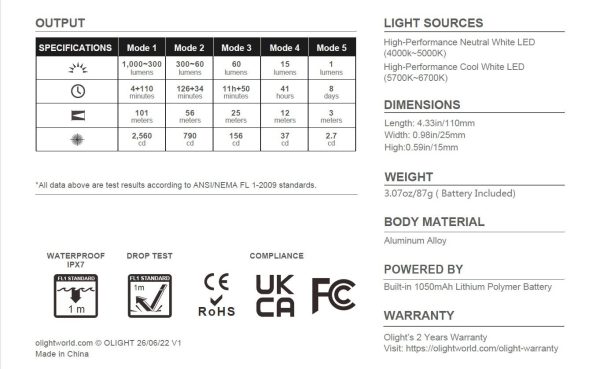 Характеристики на Фенер Olight Olight Arkfeld 1000 Лумена NW