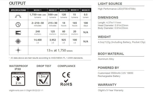 - 5 standard light modes: 1750 lumens, 500 lumens 120lumens 15lumens and 1 lumens.