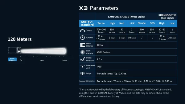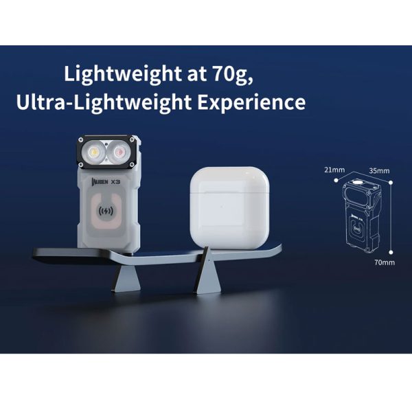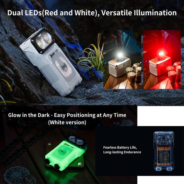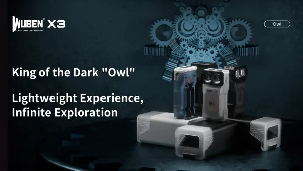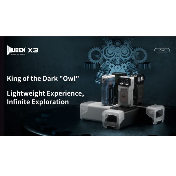 Зарядният фенер Wuben X3 е многофункционален LED EDC фенер с въртяща се на 180° глава, ултра лек с тегло само 70 гр., безжично зареждане, магнитна основа, двойни светодиоди (червено и бяло), визуален индикатор за батерията, 700 лумена и множество режими на осветяване. Това е чудесен инструмент за дейности на открито, охрана на дома и нощна работа. Wuben X3 има дизайн във формата на бухал, който е преминал през сложен производствен процес, което го прави много функционален, като същевременно запазва естетическия си вид. Той е иновативен, но изключително функционален, предоставяйки на потребителите разнообразно светлинно изживяване. Преносимата кутия за зареждане е многофункционален аксесоар, който служи както за преносимо зареждане, така и като защитен калъф и може да функционира и като захранваща банка за зареждане на други устройства. Wuben X3 разполага с двойни светодиоди (червено и бяло) – LED на Samsung LH351D с висок индекс на цветопредаване (CRI) и 650nm Luminus SST10 светодиод с червена светлина. На въртящата се глава на X3 има малък LED екран. Той показва на какво ниво на яркост сте и колко живот на батерията ви остава.