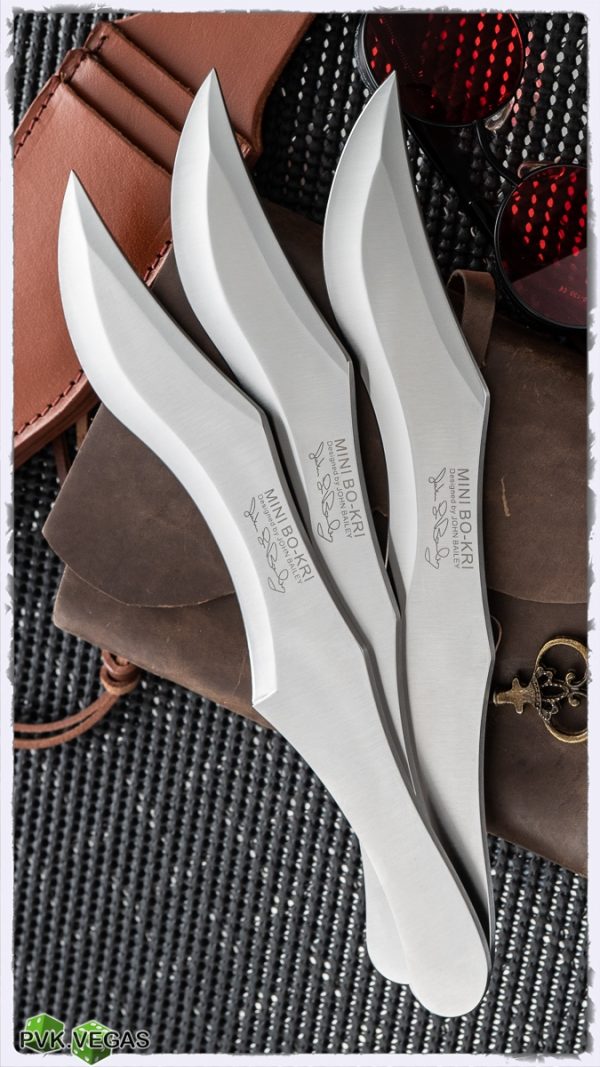 Ножът Böker Magnum Bailey Mini Bo-Kri Set е най-новият дизайн на известния хвърляч на ножове Джон Бейли. Уникалните линии и стил на този модел предлагат перфектен баланс. Ножът е изработен от неръждаема стомана 420J2 със сатенено покритие и заточено острие. Този комплект от три ножа Mini Bo-Kri включва кожена калъфка.