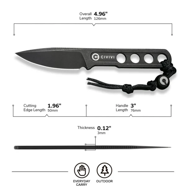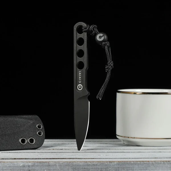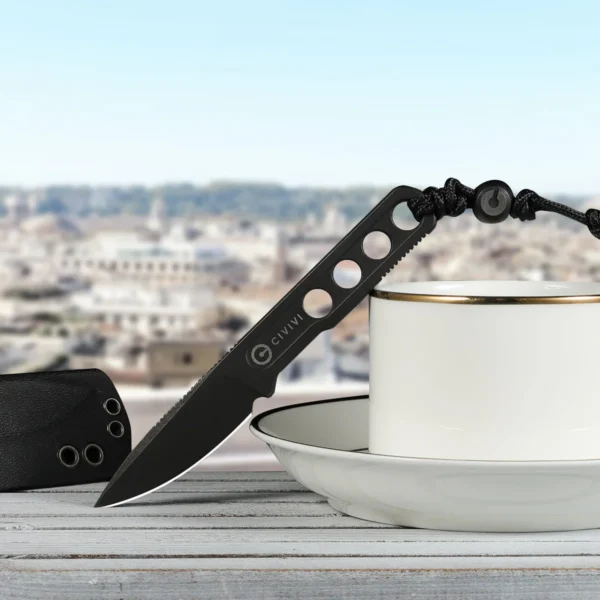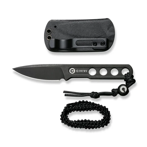 Ножът CIVIVI Circulus Black SW 10Cr15CoMoV е тънък и лек нож за врата, проектиран от Ostap Hel. Той е алтернативна версия на Minimis, също проектиран от Ostap Hel. Въпреки че ножът може да изглежда прост, той е с наистина интелигентен дизайн. Благодарение на формата на дръжката, на точните места имате достатъчно добър захват. Острието е изработено от 10Cr15CoMoV. Звучи сложно, но по същество това е еквивалент на стомана VG10. Вид неръждаема стомана, която лесно се заточва. Освен това запазва остротата си наистина добре. Civivi Circulus се предлага с кидексова кания с шнур за врата, така че да можете да го носите на врата си.