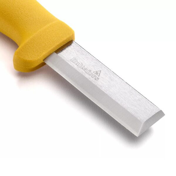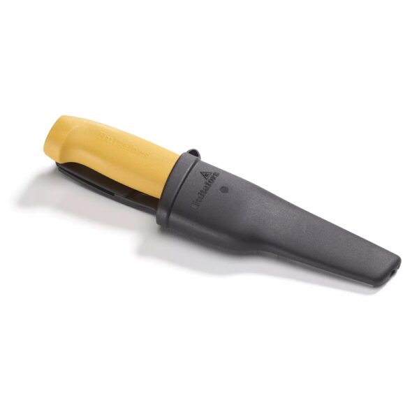 Ножът-длето Hultafors STK Carbon Steel PP е здрав нож с функция за длето с V-образно заточване. Той разполага с уникална функция за закрепване на кобура около копче на работното ви облекло, така че да не се разхлабва, като същевременно е лесен за сваляне. Острието е изработено от японска стомана за ножове, 3 мм въглеродна стомана, закалена до 58-60 HRC. Режещият ръб е заточен с двоен ъгъл и финално шлифоване на кожен каиш. Както дръжката, така и кобурът са изработени от свръхиздръжлива PP пластмаса. Кобурът може да се закрепи както към колан, така и към копче на работното ви облекло. Ако коланът ви е дебел, отрежете малката игла на капака.
