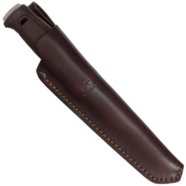 Ножът Mora Garberg Grand (S) е голям нож за оцеляване с острие с дължина 142 мм и дебелина 3,2 мм от шведска неръждаема стомана. Острието с пълна дължина е добре балансирано и се простира през дръжката, с открита задна част за удряне, остъргване или запалване на огън. Заточената част е съвместима с магнезиеви пръчки. Ножът се предлага с кожена кания. Удълженото острие прави Garberg Grand (S) достатъчно здрав за отсичане на малки дървета. Той се справя с взискателни задачи като цепене на дърва, дърворезба, рязане на клони и изграждане на подслон. Надежден инструмент за оцеляване на експедиции в дивата природа и бушкрафт. Тъмнокафявата дръжка е ергономично оформена с фрикционен захват Dala-модел и предпазител за пръсти, осигуряващи здрав захват при всякакви метеорологични условия. Ножът се предлага с калъф от растително дъбена европейска кожа в съответстващ кафяв цвят, оборудван с практична примка за колан. Острието е изработено от шведска неръждаема стомана (14C28N), дебелина 3,2 мм и закалено до 58 HRC. Предлага отлично задържане на острието, устойчивост на корозия и лесна поддръжка. Скандинавското заточване осигурява здравина и контрол при рязане и е лесно за заточване на място.