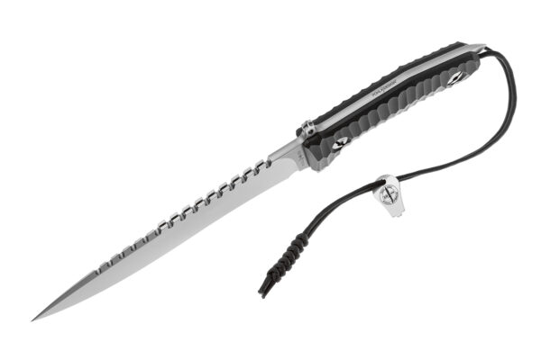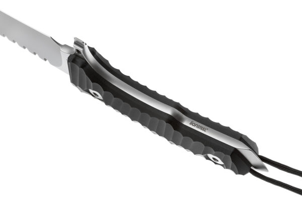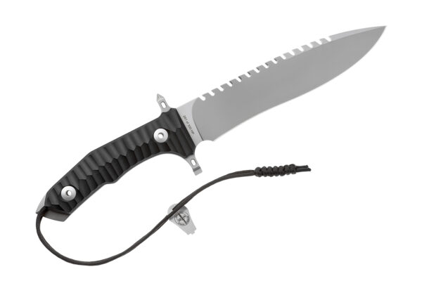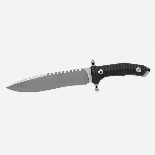 Текстурираните чирени на дръжката, изработени от черен G-10, са фрезовани с CNC от плътен материал. Материалът е изключително здрав и устойчив на механични натоварвания и други външни влияния на околната среда. Лесният достъп до кухината на дръжката е възможен с ключа, включен в обхвата на доставката.