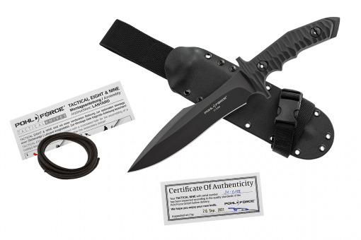 Фиксираният нож Pohl Force Tactical Nine BK – D2 е базиран на познатия MK-9. Намалено тегло и по-компактен размер. Здраво острие Bowie с дължина 20 сантиметра и дебелина 6 милиметра е подходящо за широк спектър от приложения. За висока издръжливост на рязане и еластичност е избрана инструментална стомана D2 с твърдост 59 Rockwell (HRC). Черното TiN покритие, което дава устойчива на надраскване и корозия на острието. Стъпаловидна ръкохватка изработена от здрав черен G-10, триизмерна фрезована повърхност която предлага отлично и сигурно захващане. Заоблен канал за пръсти пред предпазителя позволява преден захват. Скрит отвор в края на дръжката предлага опция за монтиране на въже (включено). Канията Kydex® на Tactical Nine BK снабдена с доказан и сменяем адаптер за колан, вложка която е стандартна за Pohl Force за намаляване драскотините по острието и за безшумно изтегляне. Регулируема каишка за крака с плъзгаща се закопчалка позволява закрепване към бедрото (свалящо се, когато не се използва). Еластичната зона в каишката осигурява високо ниво на комфорт.