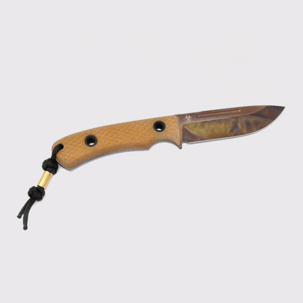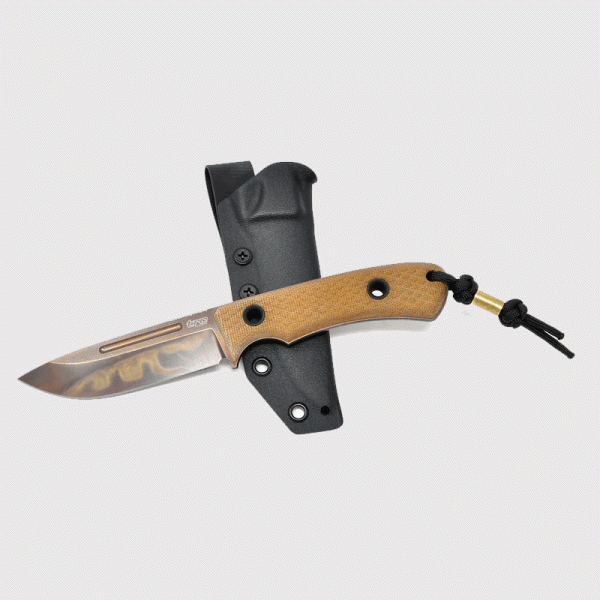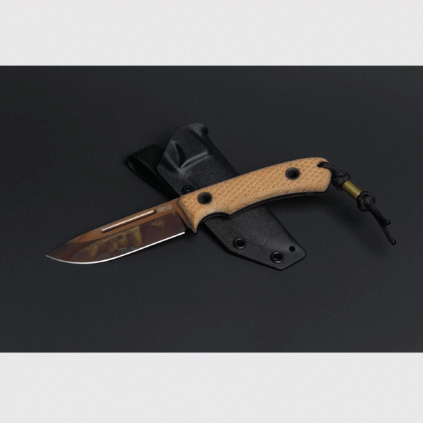Ножът TRC Knives K1S на литовския майстор ножар е направен от стомана Elmax (heat/cryo-treated) закалена до 59-61 HRC с покритие Apocalyptic finish (матово черно с медно ръждиви отенъци, на всеки нож е уникална шарката). Изцяло ръчно направен. Ръкохватка с много добра ергономия от Natural Canvas Micarta. Кания от черен Kydex подходяща за носена на колан. Всяка бройка идва със сертификат с датата на производство и единиците на закалка.
