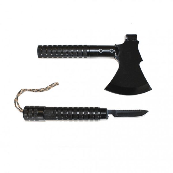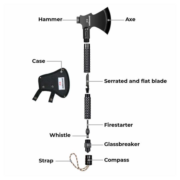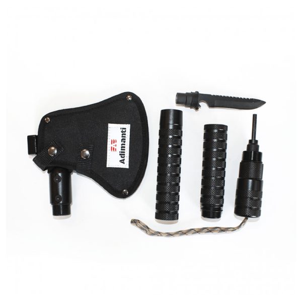 The GANZO Adimanti multi-purpose axe is the ideal survival tool for all bushcraft fans. In fact, there are several tools cleverly concealed in a detachable handle. The 8CR14 stainless steel head is equipped with a hammer on the back. The handle consists of several pieces of aluminum tubing connected by threads. The 8CR14 steel handle has a saw blade on the back and a bottle opener, glass breaker and whistle tip. There is a compass and lanyard hole at the end of the handle.