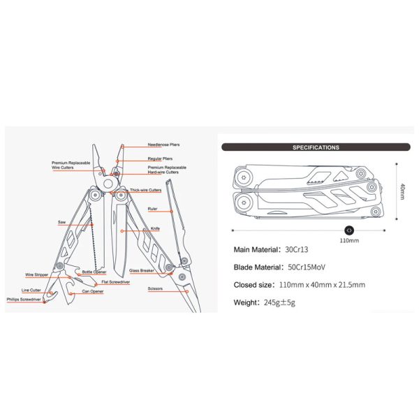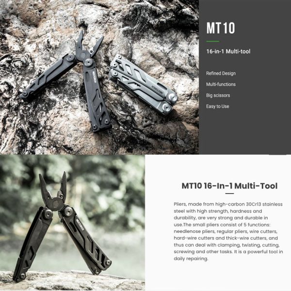 Мултитулът NexTorch MT10 е универсален многофункционален инструмент, проектиран да се справя с различни задачи с множеството си функции. Изработен от издръжлив материал на корпуса 30Cr13 и материал на острието 50Cr15MoV и ултратвърд нанокерамичен разбивач за стъкло, той осигурява надеждност в най-трудните ситуации. MT10 разполага с високоефективен трион за дърво с два реда зъби и клещие за многостранни приложения. Той е завършен с перлостоструйно покритие за повечето инструменти и сатенено покритие за триона и ножиците, осигурявайки както функционалност, така и елегантен външен вид.