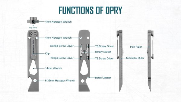 Мултитулът Olight Opry Titanium е функционален инструмент за работата съчетаващ 5 в 1. С тегло от едва 55 грама, този мултитул предлага лост, отварачка за бутилки, шестограм, отвертка, линийка и др. Изработен от титаниева сплав TC4 която осигурява висока якост и добра устойчивост на корозия и топлина. За повече комфорт е добавен клипс, който може да се прикрепи, към джоба на ризата или панталона или да се използва като щипка за пари. Olight Opry е лесен и за използване с една ръка.
