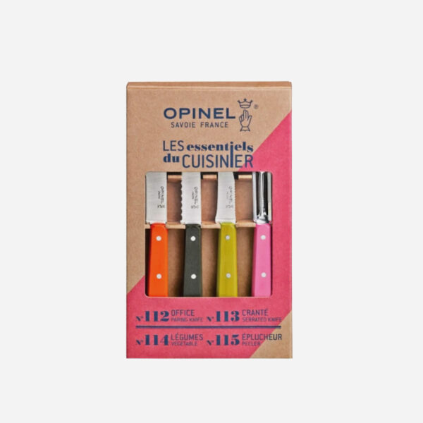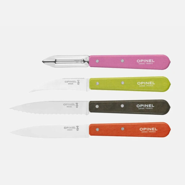 Комплектът ножове OPINEL FIFTIES се състои от 4 основни ножа за готвене: офисен нож, назъбен нож, нож за зеленчуци и нож за белене. Дръжките са лакирани. Ножът за рязане, назъбеният нож и ножът за белене са произведени във Франция. Ножът за зеленчуци е произведен в Португалия. Ножът за зеленчуци има фино острие, идеално за прецизни и деликатни задачи, като белене, гарниране и издълбаване на плодове и зеленчуци, но не е подходящ за рязане на големи зеленчуци с твърда кожа, като тиква или целина.