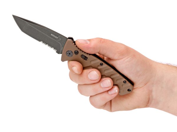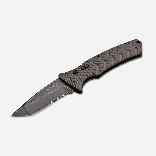 Böker Plus Strike е автоматичен нож за ежедневно ползване, със здрав пружинен механизъм. Тънката дръжка е изградена от стоманени плочи, които са оборудвани с фрезовани и леки алуминиеви чирени в цвят койот. Предпазното устройство за фиксирано заключване срещу случайно освобождаване допълнително осигурява затворения нож. С натискане на бутона острието се освобождава, след което напрежението на пружината се разгръща самостоятелно. Острието Spearpoint е направено от разработената в Япония AUS-8 стомана с черно покритие. На гърба има конвертируема скоба.