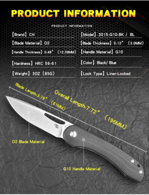 Ножът CH KNIVES 3015 D2 G-10 е практичен сгъваем нож suitable за ежедневна употреба и дейности на открито. Острието е изработено от стомана D2 със сатен покритие. Ръкохватка от материал G10, ножът е тънък , уникален дизайн, с джобна щипка и отвор за въже. и заключващ механизъм Liner Lock. Отварянето е много smoothly and seamlessly thanks to the fact that they enjoy camps. CH KNIVES provide some exceptional quality knives that will appeal to all knife lovers.