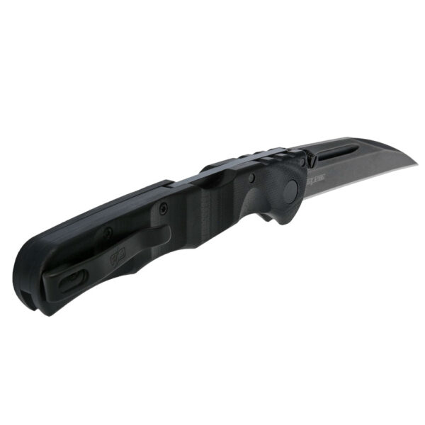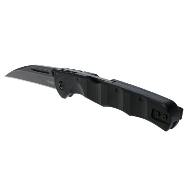 Ножът Cold Steel FRENZY II 3.5″ (BLACKOUT) 3V е многофункционален фолдър, проектиран с оглед на мощта и прецизността. Този изключителен инструмент е снабден с 3,5-инчово острие тип „овчи крак“, изработено от висококачествена 3V стомана, която отдавна е известна с изключителното си запазване на острието и устойчивост. Уникалният дизайн на острието лесно реже и прорязва различни материали, като се справя с всяка задача, която му поставите вие или природата, независимо дали е голяма или малка. Това здраво, създадено за всичко острие е прикрепено към здрава дръжка от G-10, която осигурява сигурен захват дори в най-предизвикателните условия, така че да можете да свършите работата си удобно и уверено. Формата на дръжката е съобразена с ергономията, като се приспособява към ръцете на потребителя, за да не се уморявате в продължение на часове на контролирано и прецизно рязане. Може би най-важната характеристика обаче е легендарният заключващ механизъм Tri-Ad на Cold Steel, известен с несравнимата си здравина и надеждност. Това иновативно заключване гарантира, че острието остава сигурно на мястото си по време на употреба, осигурявайки спокойствие дори в най-взискателните ситуации.
