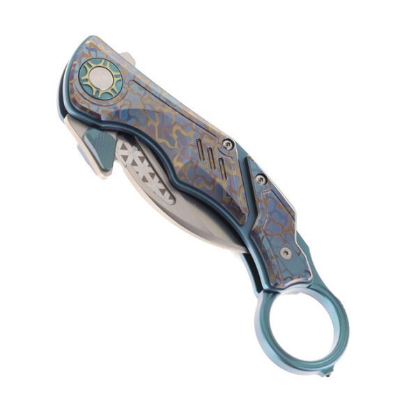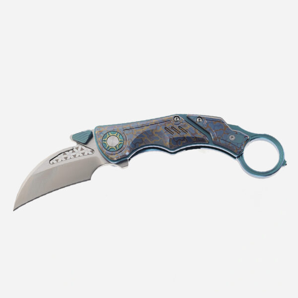 Ножът Critical Strike Predator-TGN M390 Titanium Camo е проектиран за тактическа прецизност и впечатляваща естетика. Critical Strike Predator Karambit е изработен, за да се отличава в най-взискателните условия. Този компактен сгъваем керамбит съчетава агресивен дизайн с висококачествени материали, предлагайки здрав захват, първокласна стомана и прецизни възможности за рязане – всичко това в удобна за джоба форма. Острието тип „ястребова човка“ с дължина 6,8 см е изработено от високопроизводителна неръждаема стомана M390, осигуряваща изключително задържане на острието, устойчивост на износване и защита от корозия. Завършено с елегантно покритие с бластиране, то намалява отблясъците.Формата тип „ястребова човка“ осигурява оптимално лостово действие за рязане с издърпване и други задачи, което го прави идеален за тактически приложения и отбрана в близък бой. Дръжката е изработена от титан с медни акценти и предлага лека, издръжлива и впечатляваща визуална привлекателност. Ергономично оформена за контрол, дръжката разполага и със сигурно заключване Liner Lock. Снабден с щифт за палец и флипер, Predator осигурява бързо отваряне с една ръка. Плавното му действие гарантира бързо разгръщане, когато всеки момент е от значение. Компактен и добре балансиран, този нож осигурява естествено усещане и сигурен контрол по време на употреба. Извитият му профил е проектиран да пасва удобно в дланта, подобрявайки сигурността на захвата – особено в тактически сценарии или сценарии с обратен захват. Независимо дали сте колекционер, професионалист или някой, който цени функционалността, обгърната в смел дизайн, Critical Strike Predator Karambit предлага висококачествена производителност с внушително присъствие.