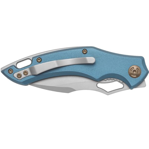Ножът Fox Edge Sparrow 9Cr13 Aluminium Blue е лек фолдър E.D.C. от италианската марка FoxEdge със синя дръжка от анодизиран алуминий и пясъкоструйна обработка. Дизайнът на уважавания италиански производител на ножове Денис Симонути съчетава трудно постижимо съотношение цена-качество и функционалност. 9Cr13MoV – съкратено наименование (9Cr13) е мартензитна инструментална неръждаема стомана. Високото съдържание на 13,5 % хром (Cr) и 0,85 % въглерод (C) осигурява висока устойчивост на корозия, а добавянето на легиращи елементи манган 1,0 % (Mn), силиций 1,0 % (Si) и кобалт 1,0 % (Co) повишава якостта и твърдостта на стоманата. Твърдостта на 3Cr13 може да варира от 60 до 62 HRC в зависимост от производителя. Лесна за заточване, широко използвана в производството на ножове, ножици и медицинско оборудване. Острие – тип Clip Point, завършено с маскиращо драскотините пясъкоструйно покритие. Дългият режещ ръб с ясно изразено коремче се спуска към острия като игла връх на ножа. Дебелината на острието осигурява висока здравина, а високата, плоска шлифовка гарантира отлични режещи свойства. Подложките са отговорни за гладкото и безпроблемно функциониране на механизма за отваряне с помощта на отвора за палец в острието. Механизъм Liner-Lock. Чирените са изработени от син анодизиран алуминий закрепен със стоманен болт към задната част. Опростената и сигурна конструкция дава гаранция за дългогодишна употреба. Предният жлеб за пръстите подобрява сигурността на захвата. Оста на въртене е украсена със стилизиран винт от стар бронз. Еднопозиционният (от дясната страна) метален клипс за дълбоко носене ви позволява да носите ножа дискретно в джоба си в позиция tip-up (острието е с върха нагоре).
