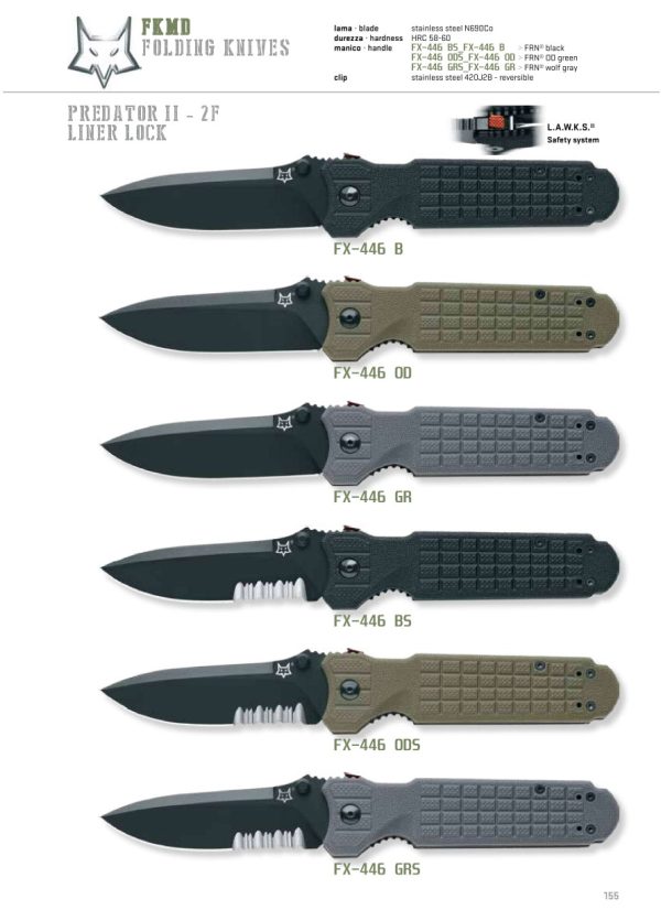 Сгъваемият нож Fox Predator II N690Co FRN black е средно голяма нож на италианската фирма FOX. Благодарение на перфектната ергономия, той пасва идеално в ръката, въпреки размера си. Перфектният нож за самозащита, използван и от любителите на открито и оцеляване. Има двойна защита срещу случайно затваряне на острието. Твърдо заключване на Liner-Lock с прорез под пръста и поставен върху гръбнака на острието, наречен „lockout lock”, т.е. L.A.W.K.S. (Lake And Walker Knife Safety). Острието е с дебелина около 3 мм с профил Drop Point, покрито с черно, устойчиво на надраскване, матово, неотразяващо PTFE покритие. Изработена от неръждаема стомана N690Co на австрийската Böhler-Uddeholm, високовъглеродна стомана с добавка на кобалт за структурна еднородност. Острието е закалено в диапазона 58-60 HRC. Гладко острие Hollow Grind, което позволява ефективно рязане. Двустранният Thumb Stud щифт улеснява бързото отваряне на острието, дори когато носите ръкавици .