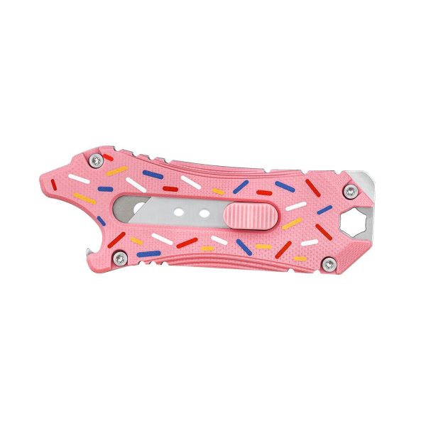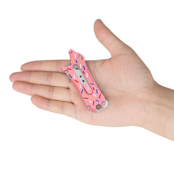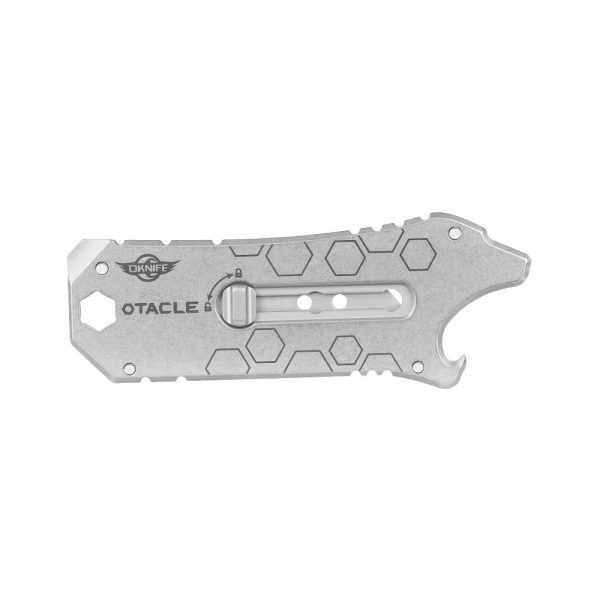 Ножът Olight Oknife Otacle SK2 Steel G10 е стилен и компактен нож EDC, който включва 5 инструмента в един. Нож, отварачка, мини щанга, плоска отвертка и шестостенен ключ 6,35 мм, който приема стандартни битове за отвертка. Острието е изработено от стомана SK2. Ножът има уникална форма на лъв, изключително малък с размери 85,8 х 32.7 х 6.8 мм. лек и се побира лесно в джоба . Пружинният страничен бутон работи гладко и стабилно, фиксира острието в 3 позиции. Otacle е със стандартни сменяеми остриета (НЕ са включени в комплекта). Смяната на острието е бързо и удобно. Ръкохватката е изработена с чирени от G10, заключването на острието е със система Slide-Lock която работи плавно във всяка от трите позиции на острието. В края на ръкохватката има отвор за ремък.