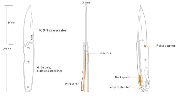 Ruike P848-B е компактен, безопасен за носене EDC нож, с острие изработено от Sandvik 12C27 стомана с криогенна закалка до твърдост 58-60 HRC. Без стърчащи флипер или пин за палеца, а с отваряне с нокът. Дръжка от G10, заключваща система Liner lock. Лагери осигуряват плавно отваряне.