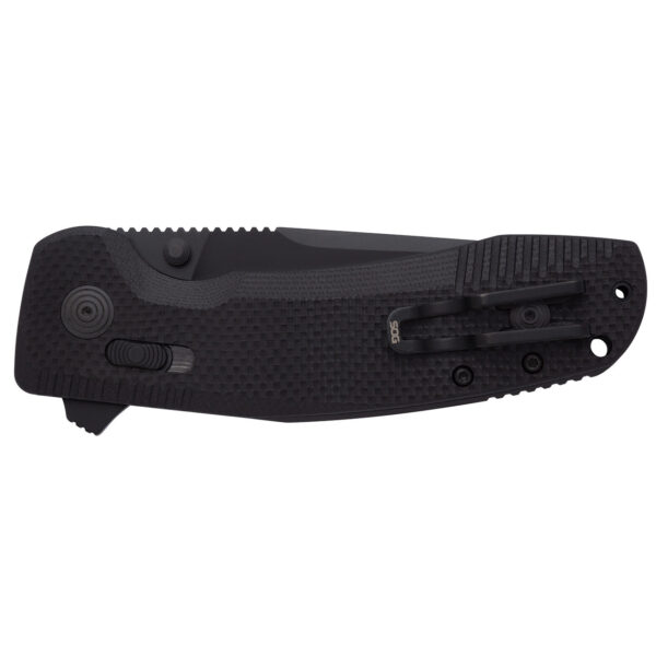 Ножът SOG TAC XR Blackout D2 G10 за професионалисти в униформи. SOG-TAC XR е с 3,4-инчово острие от криогенно термично обработена инструментална стомана D2 и дръжка от G10 с изключително удобен захват. Ключалката XR на SOG позволява плавно двустранно отваряне с една ръка по три различни начина и изключително сигурно заключване на острието след отваряне. Следващото поколение проектирани и разработени характеристики на тактически джобен нож.