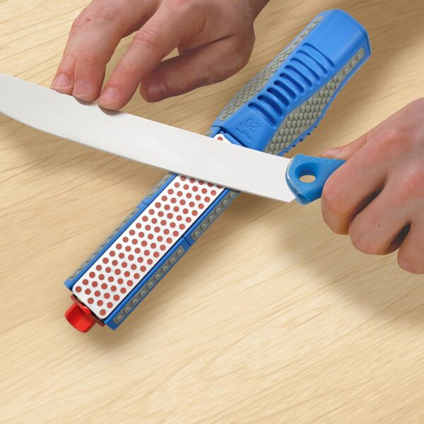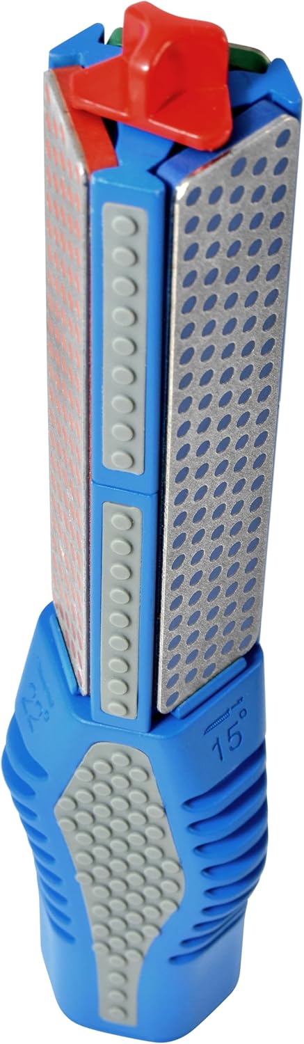 Тристранното въртящо точило DMT EdgeSharp TriStone Rotator Sharpener е ръчна система за заточване, която ви позволява да заточвате с 3 различни зърна под 3 различни ъгъла с просто завъртане на върха. Насладете се на прецизно заточване с 3 диамантени камъка: грубо (325) за трансформиране на тъпи ръбове, фино (600) за усъвършенстване на тъпи остриета и изключително фино (1200) за постигане на остър като бръснач ръб. Може да заточите вашият нож с 3 интегрирани ъглови водача (15, 20 и 22°), избирате камъка и го завъртете до желания от вас водач под ъгъл. Бързо и лесно разпознаване на едрината, синьо за съживяване на повредени ръбове, червено за усъвършенстване на тъпи остриета и зелено за полиране до остро като бръснач съвършенство. Ръкохватката на това точило ви осигурява удобна, нехлъзгаща се ергономия, независимо дали сте на плота или в ръка. Лесно почистване, насладете се на надеждното, дълготрайно диамантено точило за ножове във всички аспекти на заточване и усъвършенстване на ножове.