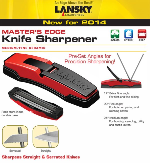 Заточва прави и серетирани остриета. Master’s Edge системата включва чифт medium карбидни пръчки и fine керамични пръчки за заточване и професионален клас на полиране. Кутията е с предварително зададени градуси, има гумена нехлъзгаща основа, интегриран предпазител за ръката и място за съхранение на пръчките. Подходяща е за заточване на ножове, шила, рибарски кукички и други.