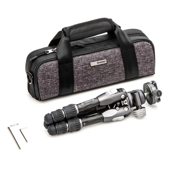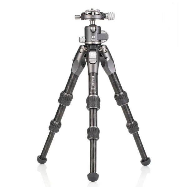 Карбоновият статив Benro Tortoise TTOR03CGX25 комплект с глава е малък, но изключително здрав, с GX25 ябълковидна глава от Benro, компактен, лек статив с висока товароносимост и забележителна стабилност. Дизайнът без централна колона го прави функционален и лек за пътуване и намалява възможността за разклащане, характерна за позиционирането на високата централна колона. Това е особено важно при заснемане на видео. Краката предлагат независимо разгъване и три заключващи позиции и включват автоматично регулиране на ъгъла на крака. Гумените крачета имат три различни контактни повърхности, осигуряващи захват независимо дали краката са вертикални, под ъгъл или почти хоризонтално позиционирани.