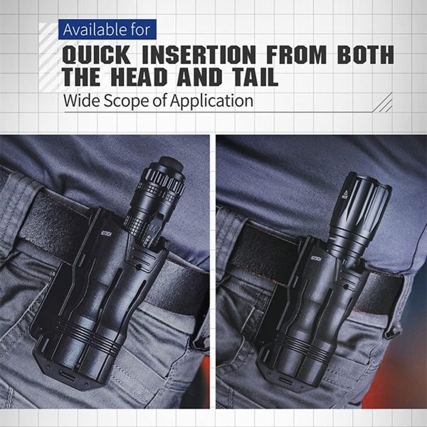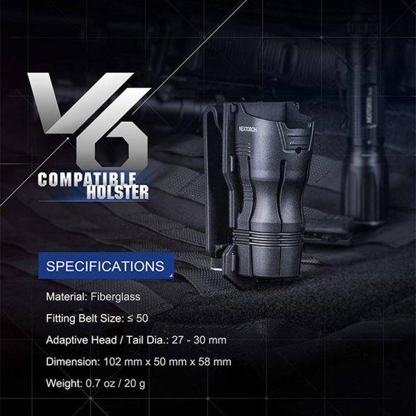 Калъфът за фенер Nextorch V6 е снабден с въртящ се на 360° корпус и дизайн с двойно отваряне. Лесното му регулиране ще улесни ползването му и е съвместимо с почти всички фенерчета. Съвместим диаметър на главата/опашката на фенерчето: 27 – 30 мм. Подходящ за TA30, TA01, TA15, E6 и други фенери.