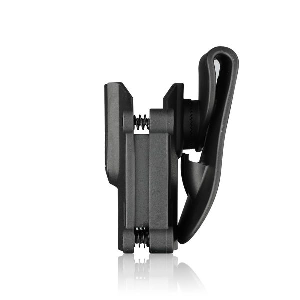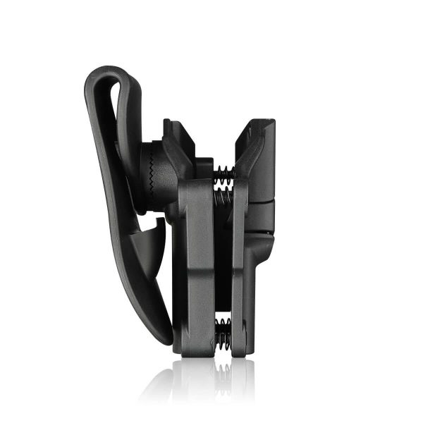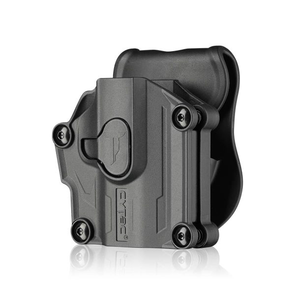 Универсаленият кобур Cytac Mega-Fit Holster Compact е за лява ръка и изработен от удароустойчив хай-тек полимер (Съхранение: -40℃ to 200℃). Кобура е снабден със заключващ механизъм level 1 с възможност за бързо вадене. При връщане на оръжието в кобура, то автоматично се заключва в него и няма опасност от неволно изпадане, изгубване или отнемане. Крепежът към колана и тялото е гумиран от вътрешната страна за по-добър комфорт при носене. Ъгъла на носене на оръжието може да се регулира на 360 градуса, с помощта на ключе, което е в комплект.