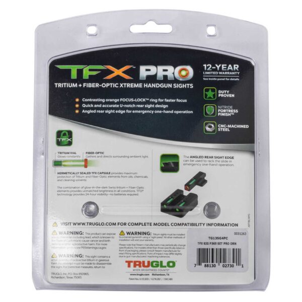 Мерните прибори Truglo са винаги готови, светещи ярко както през деня, така и през нощта. Tritium + Fiber-Optic технология компактен дизайн без препятствия, по-дълъг радиус на видимост и удивително издръжлива конструкция, създадена да се справи с почти всичко. Светещите елементи са обвити в практически неразрушима химически и удароустойчива капсула, а CNC машинно обработената стомана е защитена с устойчив на ръжда FORTRESS FINISH™. Двете точки на мерника трябва да са на една и съща равнина с точката на мушката, която трябва да е насочена към центъра на мишената. За тази цел върхът на мушката има контур FOCUS-LOCK™ за заключване на фокуса. Продуктът е с 12 години гаранция. В комплекта има шестостенен ключ за монтаж на уредите.