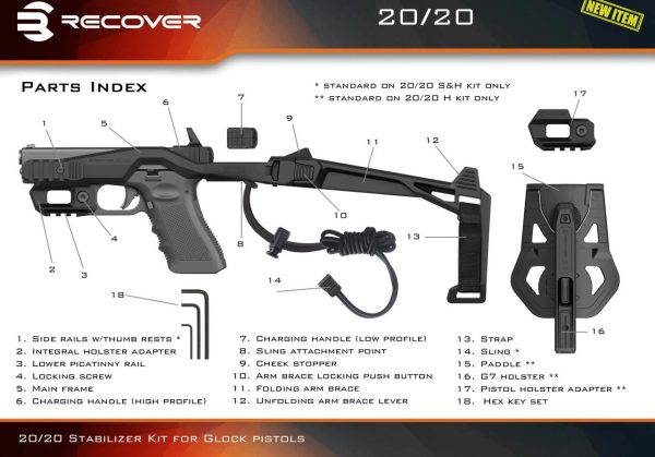 Докато самата рамка на стабилизатора 20/20N е съвместима с моделите GEN 5 .40 G22, G23, G24, G27* и G35 Glock, заевора на GEN 5 не е съвместим с включената дръжка за зареждане Recover tactical UCH/GCH. Тъй като рамката на стабилизатора покрива накатката по затвора, имате нужда от алтернативен начин да позиционирате плъзгача като RMR или друго решение. Ако имате затвор GEN 5 и алтернативен начин за преместване на плъзгача, можете да използвате 20/20N.