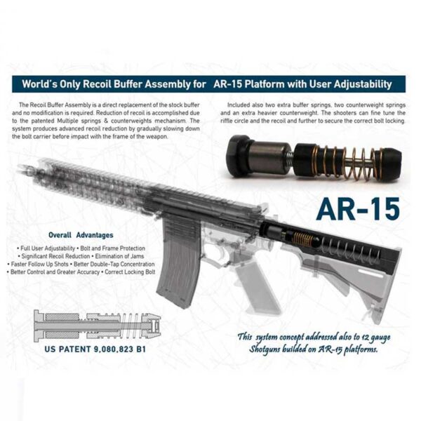 Пружинaта DPM за Бойни Карабини AR-15 9×19 PCC Rifles Blocked Bolt Carrier (without hole) User Adjustability е директен заместител на буфера на приклада и не е необходима модификация. Намаляването на отката се постига благодарение на патентования механизъм с множество пружини и противотежести. Системата произвежда усъвършенствано намаляване на отката чрез постепенно забавяне на затворния носач, преди да спре в дъното на тръбата. Включени също 2 допълнителни буферни пружини, 2 пружини за противотежест и допълнителна по-тежка противотежест. Стрелците могат фино да настроят кръга на пушката и отката и допълнително да осигурят правилното заключване на затвора.