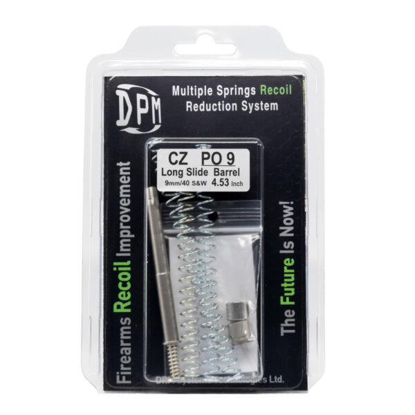 Пружинaта DPM за Бойни Пистолети CZ 75 P09 LONG BARREL 4.53″ 9mm-40s&w e телескопична механична система за намаляване на отката DPM е директен заместител на пръта за откат и не променя конфигурацията на пистолета. Тази система работи благодарение на многопружинния сложен прът (3 пружини) и контролира функционалността на пистолета. Третата пружина, която се съдържа в пръта, контролира движението на плъзгача, така че никога да не се блъска в рамката. Системата включва 2 различни пружинни тапи и 3 различни външни пружини. Тъмносивата пружинна тапа предлага по-силен буферен ефект от сребристата пружинна тапа, която предлага по-лек буферен ефект (плъзгащо се напълно отворено положение). Външните пружини са с различна дължина, така че стрелецът да може фино да настрои пистолета в позиции за отваряне и заключване (плъзгане на батерията) според личните си стандарти.