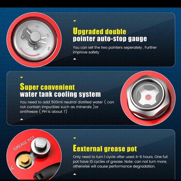 Компресорът за въздушно оръжие GAOROBAM GX PUMP E-CS4 има нов, подобрен 350W мотор и използва четиристепенна технология за компресия. Той е много стабилен при работа и е много тих, само 70db. Максимално налягане на пълнене 5800Psi/40Mpa. Същевременно е оборудван с манометър с двойна стрелка и двустепенна настройка на налягането за автоматично спиране, което е по-сигурно. В горната част на компресора са разположени резервоар за вода и резервоар за грес. Отличното охлаждане може да осигури 5 часа непрекъсната работа и да запълни максимален газов цилиндър от 6,8 литра. Забележка: За първа употреба, компресорът трябва да се напълни с 300ml антифриз (не се препоръчва употребата на чиста вода). Не завъртайте копчето за грес, докато не изминат 4-6 часа, след което го завъртете с едно завъртане. След това, ако скоростта се е забавила и компресорът отново се е завъртял, не е необходимо да добавяте грес. 15% по-бърза скорост на пълнене: Пълненето на резервоар от 0,5 л от 3000 Psi до 4500 psi отнема само 4-5 минути. Пълненето на резервоар от 0,5 л от 0 до 4500 psi отнема само 14-16 минути. Пълненето на бутилка от 6,8 л от 0 до 4500 psi отнема 2 часа и 40 минути. 12V DC вход, можете да използвате автомобилен акумулатор или домашен контакт за захранване, оборудван с конвертор 220V-12V. Машината е оборудвана с вграден сепаратор масло-вода, който никога не се нуждае от подмяна, така че не е необходимо да купувате други външни сепаратори масло-вода. Моля, прочетете внимателно ръководството за потребителя, преди да включите компресора. Всички GX помпи се предлагат с 12 месеца гаранционно обслужване и доживотна технологична поддръжка. Размер на продукта: 11,8*6,1*12,4 инча, тегло: 29 фунта (11,8*6,1*12,4 инча), тегло: 29 фунта (12,4 кг).