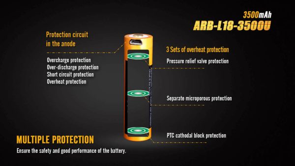 Зарядната батерия ARB-L18-3500U USB е най-мощната батерия от тип 18650 на Fenix. Тя може да се зарежда от вградения USB порт или от външно зарядно устройство. В анода е вградена защитна верига и покрита с нитована стоманена обвивка като по този начин потенциалният риск от късо съединение, причинен от сблъсък или удар, е максимално елиминиран!