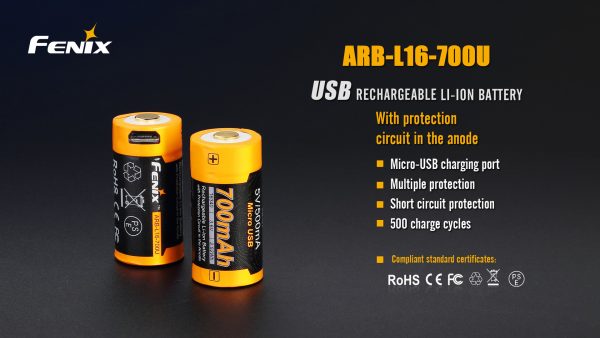 Литиево-йонната акумулаторна зареждаща се батерия ARB-L16-700U може да се зарежда от собствен USB порт, както и от зарядно устройство. В анода е вградена защитна верига покрита с нитова стоманена шапка предпазваща от прекомерно зареждане/разреждане и прегряване. Батерията е изцяло покрита със стоманена обвивка, така че потенциалният риск от късо съединение, причинено от сблъсък или удар, е значително елиминиран.