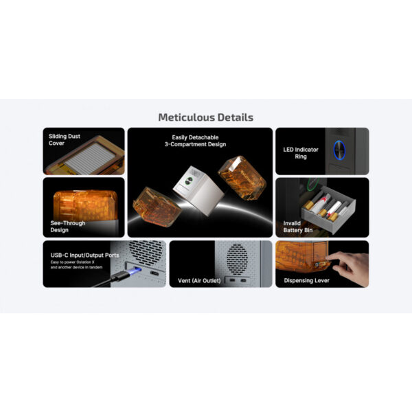 Зарядно устройство Olight Ostation X, 3 в 1 за всякакви батерии Ni-Mh 1,2V AA с капацитет до 32 броя батерии. Устройството е преминало над 10 000 теста с батерии на 15 производителя, както и оригинални батерии Olight. Просто поставете батериите, без значение от марката и поляритета. Устройството само ще установи изправността и полярността на батериите и ще започне да ги зарежда. Можете да избирате между стандартно зареждане (до 3,8часа) или бързо зареждане (до 2,5 часа), като се зареждат по етапно, по 4бр. батерии едновременно. Устройството разполага със система за охлаждане и общо 7 вградени защити. Имате пълен контрол върху процесите с помоща на приложението за смартфон.