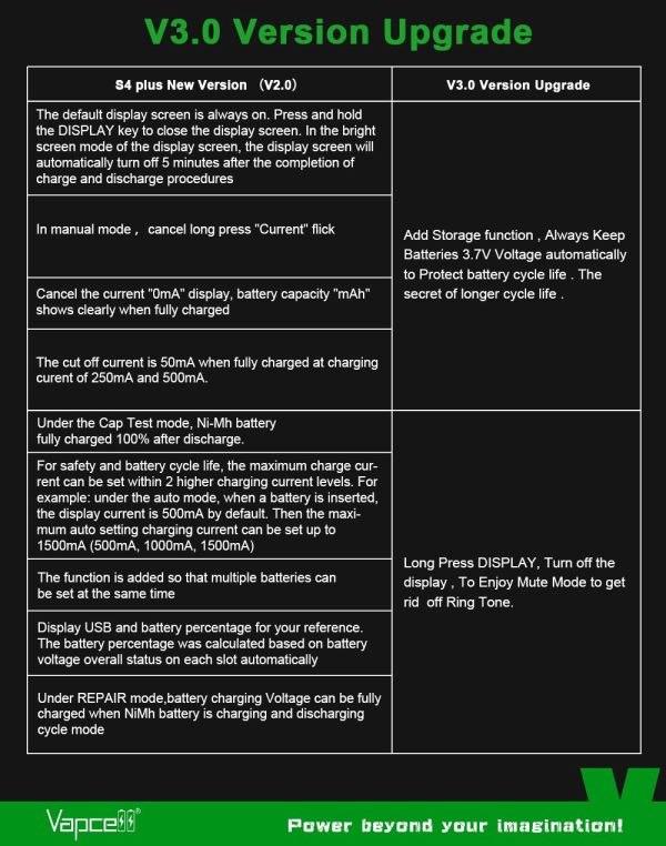 • Добавена функция за съхранение на батерии – автоматично поддържа напрежението на батериите 3.7V, за да защити и удължи живота им