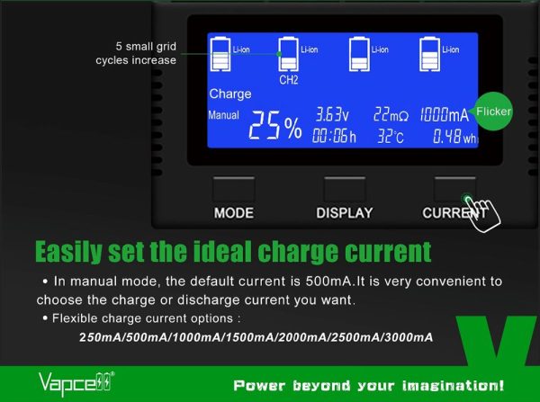 • Автоматично – разпознава химията на батерията и състоянието и за да зарежда с точните параметри. Има широк диапазон на зарядния ток от 0.25А до 3А.