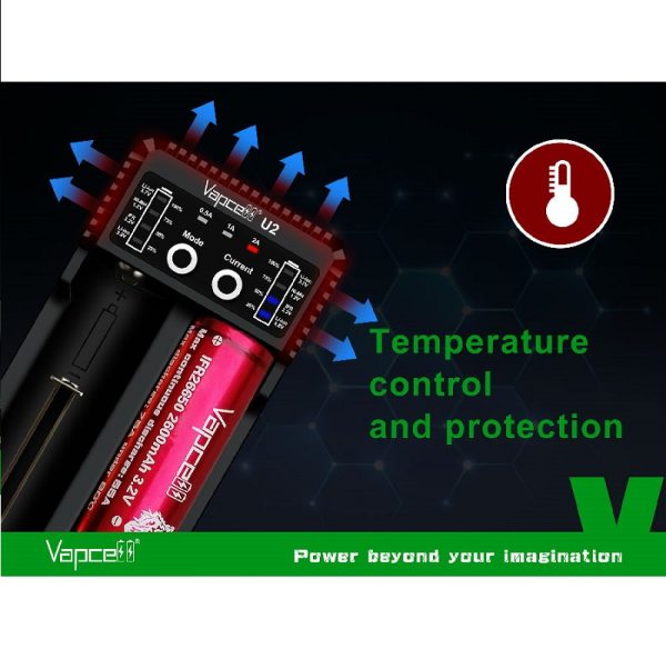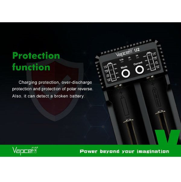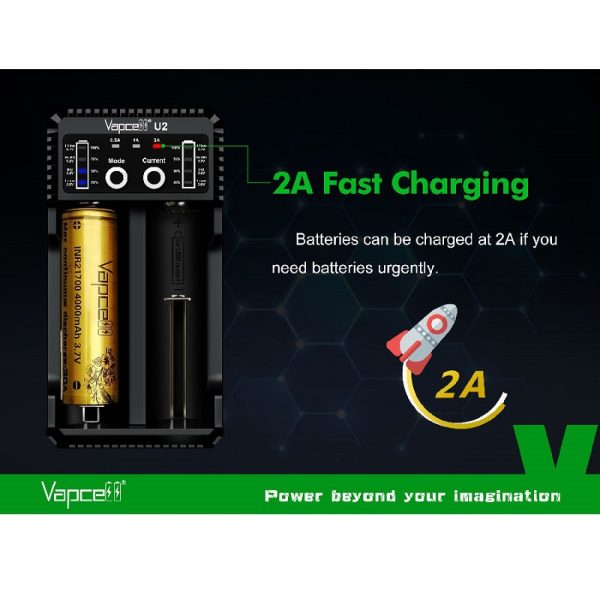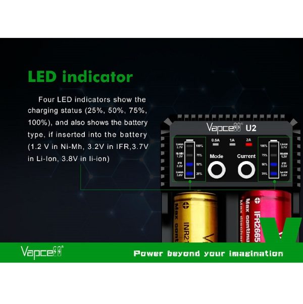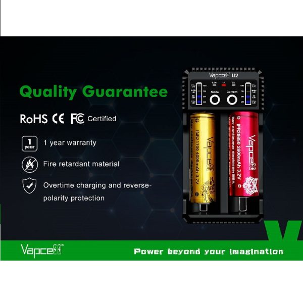 Vapcell U2 е едно от най-добрите универсални USB зарядни за едновременно зареждане на една или две батерии. Може без проблем да побира батерии с диаметър от 10 до 26 мм и дължина от 34 до 75 мм. Препоръчително е да се включи към адаптер за телефон, независимо дали е за 220В или за автомобил. Зарядното може да зарежда с 0.5А или 1А две батерии едновременно и с до 2А една батерия. В допълнение зарядното може да зарежда други устройства с до 1А с вградения USB порт. Показва с чертички приблизителния заряд на батерията и автоматично спира при пълното и зареждане