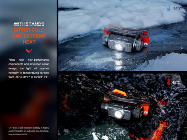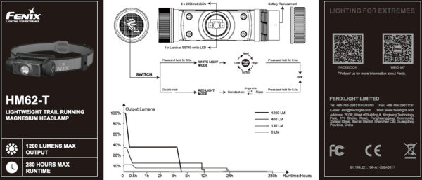 Челник FENIX HM62-T LED е компактно челно фенерче за спорт, което е изработено от първокласна магнезиева сплав с изключително ниско тегло и е идеално като основен челен фенер за бягане или като висококачествен резервен вариант, ако събитието ви изисква да носите резервна светлина. Този модел се отличава с мощен неутрално бял лъч с мощност 1200 лумена, допълнен от червена светлина за защита на нощното виждане. Fenix HM62-T е не само отличен за предназначението си, този продукт е идеален и като издръжлив работен фенер с общо предназначение, за туризъм, за риболов и пещерено изучаване. С допълнително удобство и комфорт на регулирането на лентата за глава SPORT. Впечатляващата двупосочна, регулируема с кликване лента за глава Sport на Fenix е включена за удобно регулиране в движение. Лентата за глава включва и силна, нископрофилна свирка за аварийни ситуации. Челникът за бягане по пътеки Fenix HM62-T се управлява с един голям бутон и се захранва от включената в комплекта батерия 3400mAh 18650. Батерията се зарежда чрез USB-C порт, разположен в самата батерия (кабелът за зареждане е включен в комплекта). Резервните батерии могат да бъдат закупени отделно, за да се удължи времето за работа.