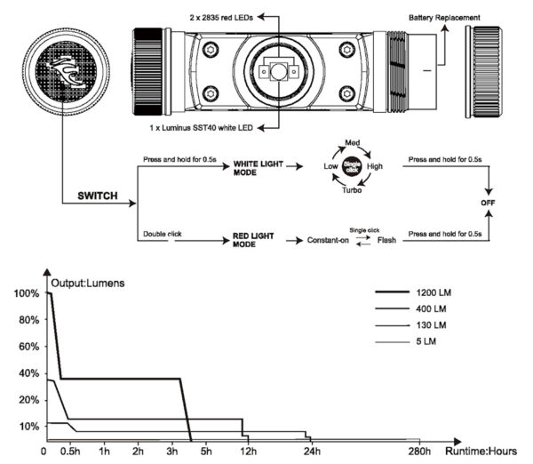 - Режими на осветяване: 6 режима, включително 4 нива на бяла светлина и 4 нива на червена светлина