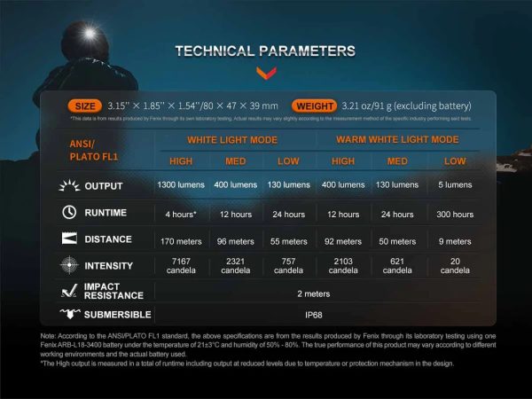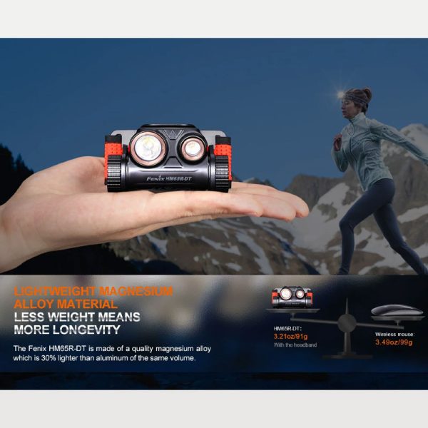 Челникът Fenix HM65R-DT е от най-висок клас, предназначен за дълго бягане по пътеки. Той може да се похвали с до 1500 лумена, разстояние на хвърляне 170 метра, топла бяла LED светлина (3000K) и конструкция от лека магнезиева сплав. Лентата за глава използва системата SPORT fit, която осигурява удобно и гъвкаво регулиране на лентата с една ръка, докато бягате. Друга страхотна характеристика на този челник е, че може да издържи на лют студ и екстремна топлина. Снабдена с високоефективни компоненти и усъвършенстван дизайн на веригата, светлината ще работи нормално при температури, вариращи от -35 градуса по Целзий / -95 градуса по Фаренхайт до 45 градуса по Целзий / 113 градуса по Фаренхайт. Времето за зареждане е около 3 часа от изтощен до пълен заряд. За да заключите или отключите светлината, натиснете и задръжте някой от превключвателите за 3 секунди, докато светлината е изключена. Топлата бяла светлина ще мига 4 пъти, за да покаже състоянието на заключване.