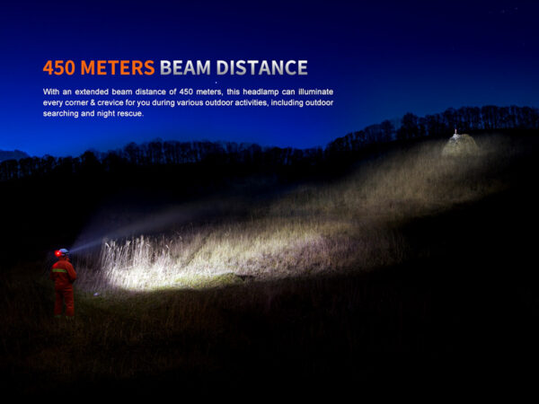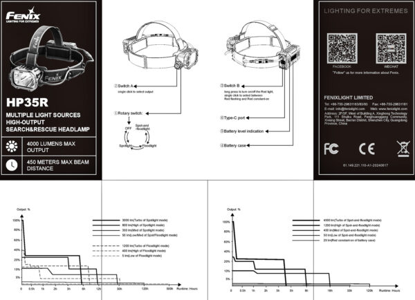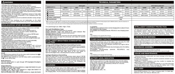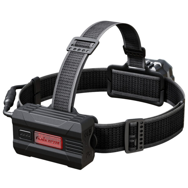 Челникът Fenix HP35R Professional 4000 Лумена е проектиран за употреба на открито и за обща/всекидневна работа, Fenix HP35R е универсален, изключително мощен фар с 3000 лумена с разстояние на осветяване 440 метра и впечатляващ прожектор с 1200 лумена. Захранването е от акумулаторна батерия с капацитет 10 000 mAh, монтирана отзад, и се управлява от въртящ се превключвател на режимите и централен бутон за регулиране на яркостта. Топлият бял основен лъч се отличава с 4 нива на яркост от 50, 350, 800 и 3000 лумена. 2 х 600 лумена неутрално бели прожектора осигуряват 5, 50, 400 и 1200 лумена. Включете ги всички, за да превърнете нощта в ден с 4000 лумена светлина! С големия капацитет на батерията, ефективната алуминиева радиаторна глава и компонентите с индустриално качество HP35R може да поддържа екстремна мощност много по-дълго от конвенционален фар, като същевременно ефективно разсейва генерираната топлина и води до по-дълъг експлоатационен живот. Тежкият комплект батерии се сваля лесно от лентата за глава и може да се използва в чанта или джоб заедно с включения удължител. Калъфът на батерията включва 4 x LED индикатори, показващи състоянието на зареждане и нивото на батерията, както и USB-C входно-изходен контакт за използване като 10 000 mAh захранваща банка. Включена е червена задна светлина със собствен превключвател за работа за критични за безопасността приложения. Този модел е съвместим с кутиите за батерии HP30R V2.0, така че тези, които търсят ъпгрейд могат да използват съществуващите си батерии. Fenix HP35R разполага с интелигентна функция за намаляване на яркостта, която намалява мощността до минимум когато се намира в непосредствена близост до обект (60 мм), за допълнителна безопасност и за защита на ламповия блок. Тази функция може да бъде изключена, ако е необходимо. Лампата е напълно устойчива на атмосферни влияния и разполага с вътрешен водоустойчив контакт за зареждане за по-голяма надеждност.